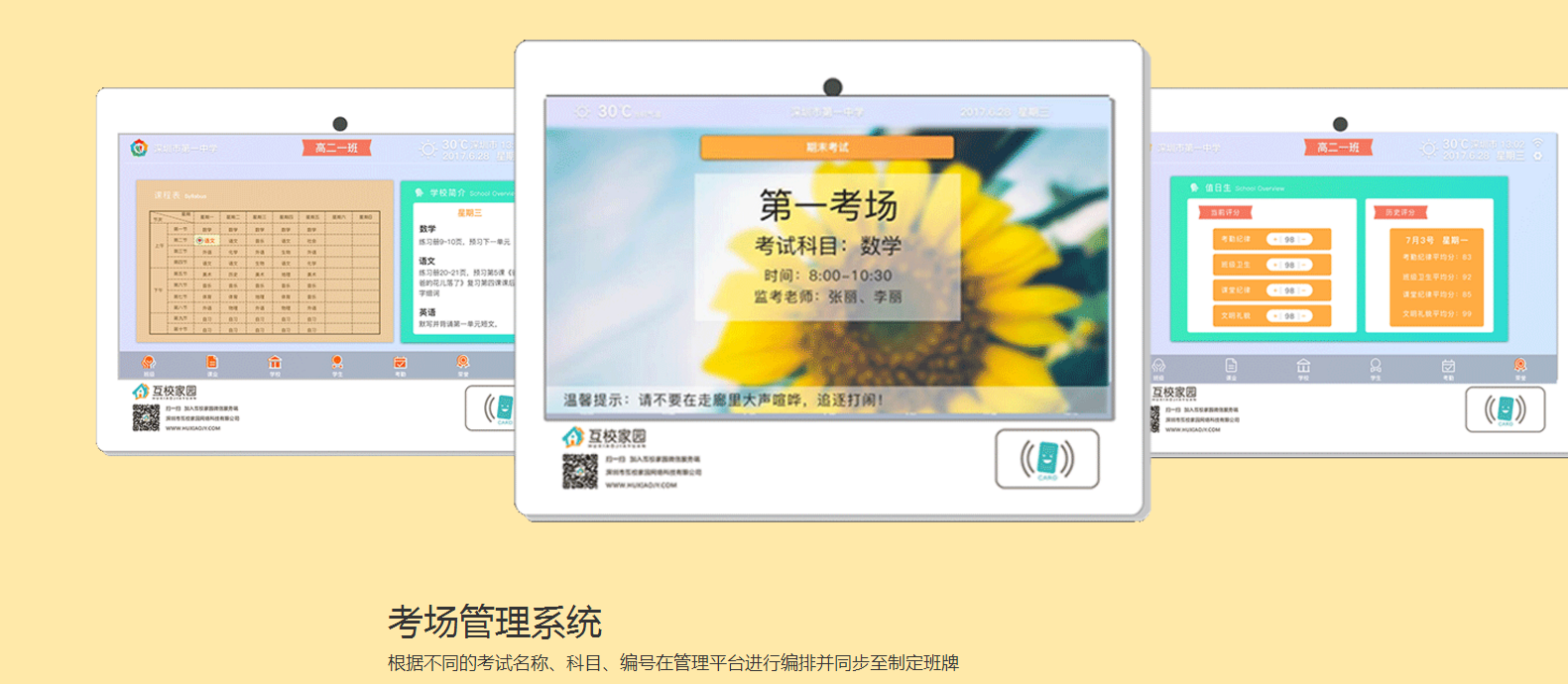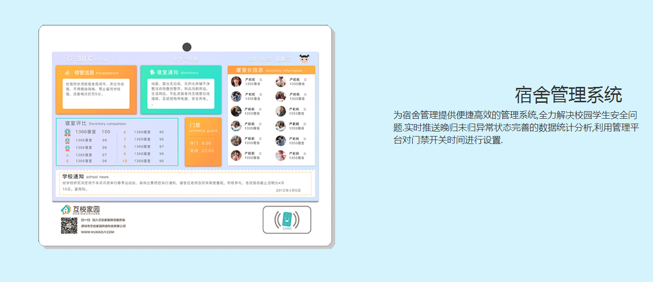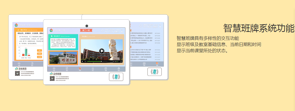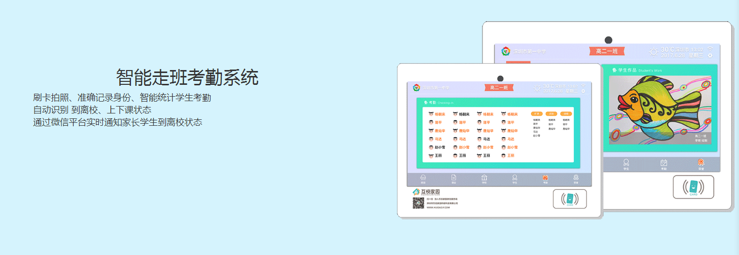產品描述:可重點展示班級信息、考勤信息、多媒體展示、通知、值日生、課表、作業(yè)、天氣、重要節(jié)日倒計時等信息。支持學生通過刷卡或人臉識別進行進(離)校考勤。學生可通過刷卡進入查看個人自己的課表、成績、考勤、以及聯(lián)系人并與聯(lián)系人實現(xiàn)互動。